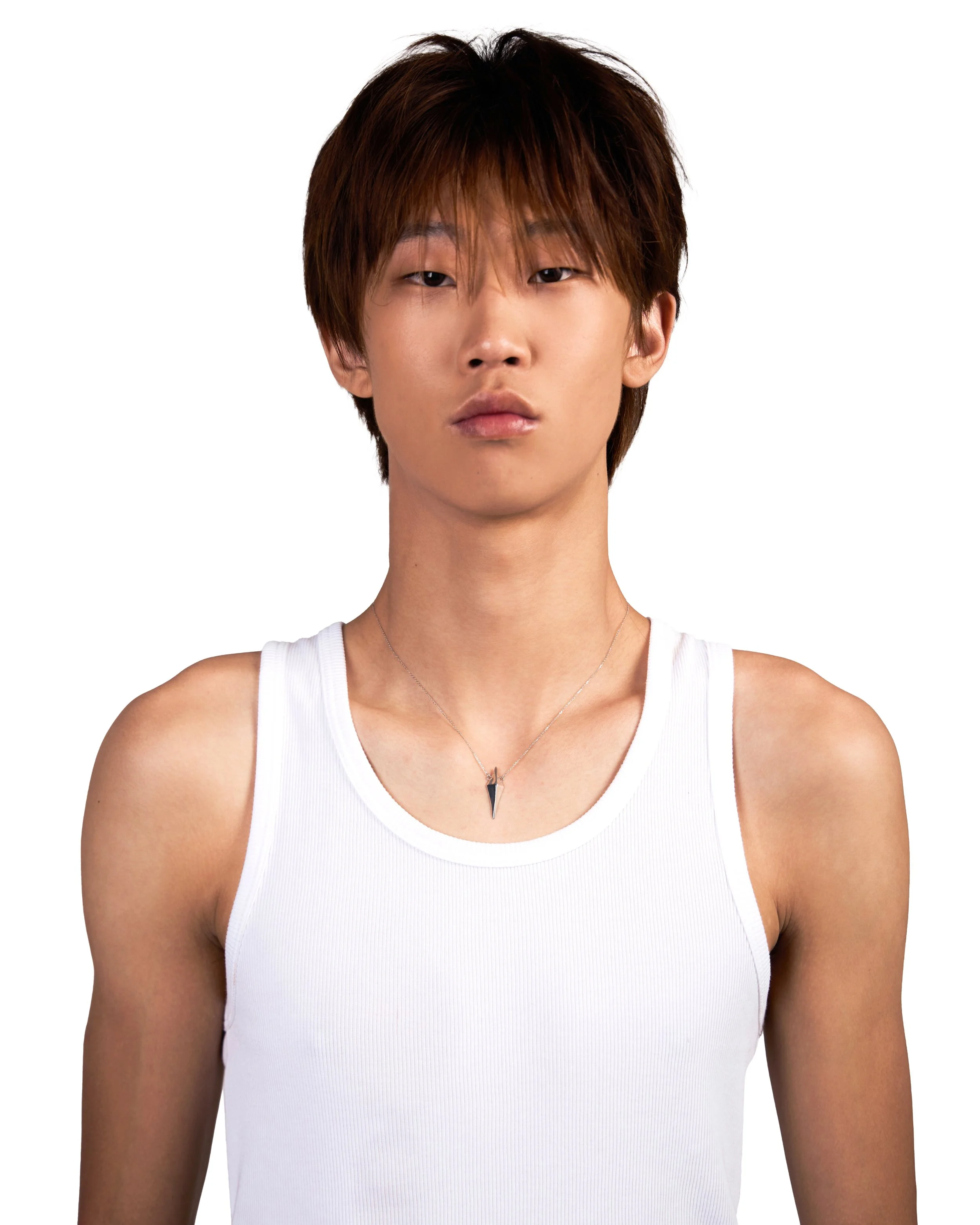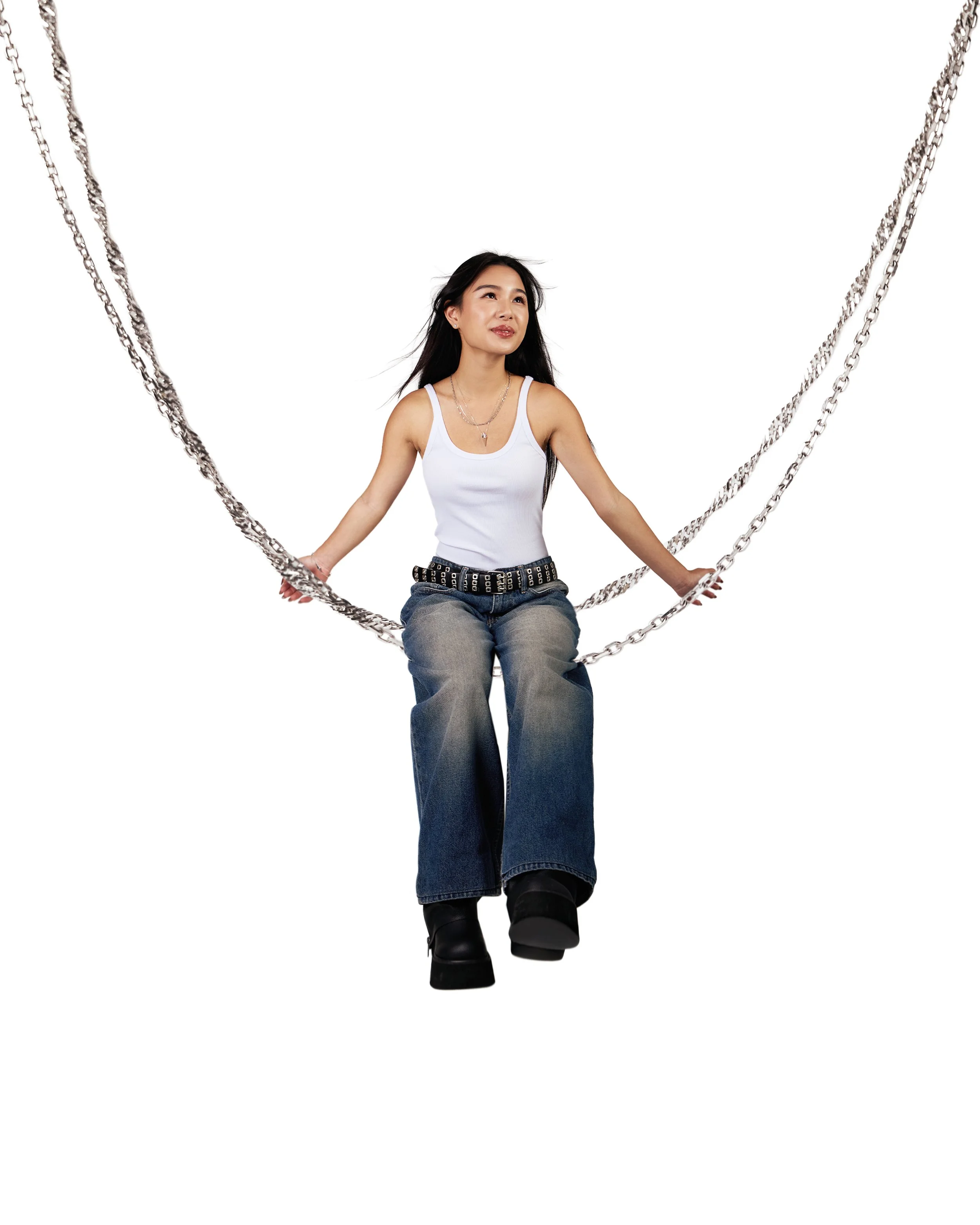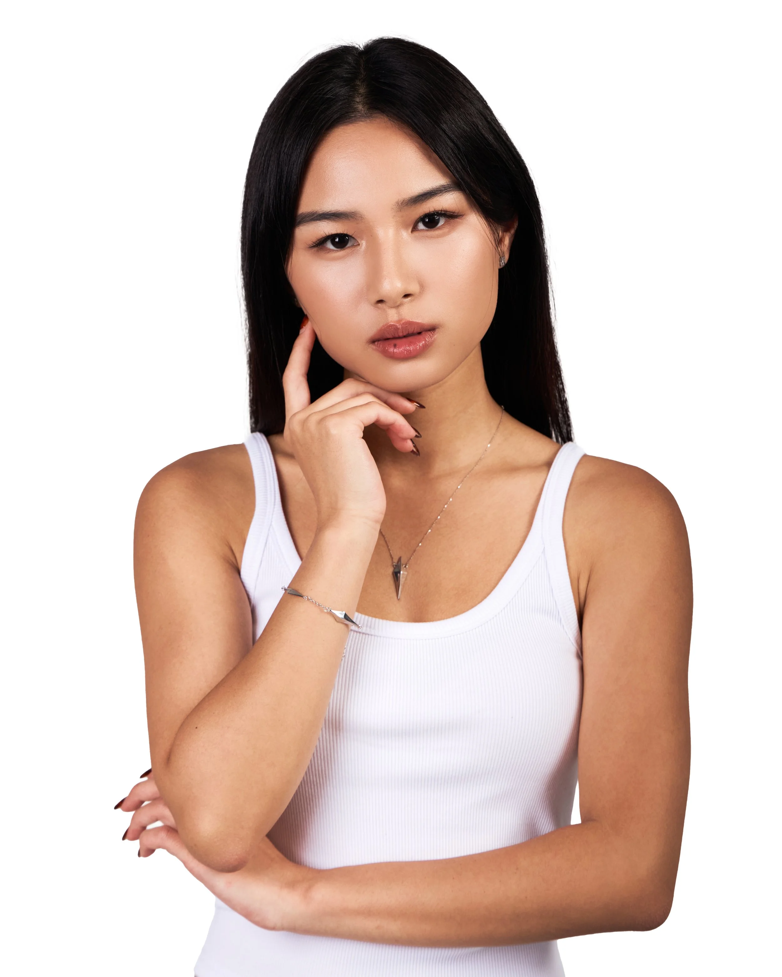 A person with black hair, wearing a black zip-up hoodie, holding multiple silver necklaces and bracelets in different poses against a white background.